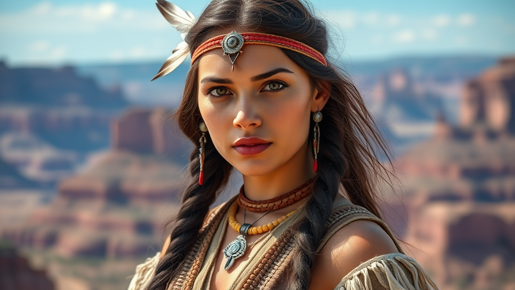 mdjrny-v4 style portrait photograph of Madison Beer as Pocahontas, a young beautiful Native American woman with a perfectly symmetrical face, adorned in feather jewelry and a traditional handmade dress. She stands as a skilled female hunter warrior against the breathtaking Utah landscape. The scene is captured in ultra-realistic concept art with elegant details, emphasizing depth of field, portrayed in 8k resolution. Artistic influences include the styles of Artgerm, Greg Rutkowski, and Alphonse Mucha, adding a touch of fantasy while retaining the essence of majestic strength and natural beauty.