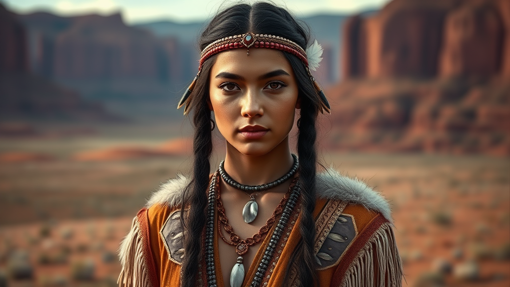 Mdjrny-v4 style portrait photograph of Madison Beer as a Pocahontas-inspired character, a young beautiful Native American woman with a perfectly symmetrical face, adorned with intricate feather jewelry. She wears a traditional handmade dress that hints at her role as a skilled female hunter warrior. The setting is an expansive Utah landscape, captured in ultra-realistic detail reminiscent of concept art. The visual style takes inspiration from artists like Artgerm, Greg Rutkowski, and Alphonse Mucha. The scene incorporates elements such as dark tones, white fur, and luxurious gold fabric, all highlighted by a soft depth of field. She stands as a solitary figure against the majestic backdrop, exuding elegance and strength without any distortions or additional features, maintaining the focus on her singular presence in this awe-inspiring environment.