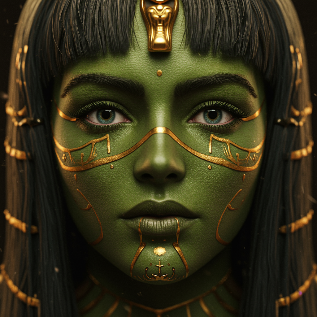 mdjrny-v4 style young female face with a verdant aesthetic, featuring the golden ratio and symmetrical elegance, enriched with ornate luxury, ultra realistic appeal, and concept art mastery. Immensely intricate and highly detailed with photorealism, rendered in octane with 8k precision and powered by the unreal engine. Sharp focus showcases the volumetric lighting akin to art by Artgerm, Greg Rutkowski, and Alphonse Mucha infused with Vraska Golgari elements. A close-up highlights an individual adorned with intricate Egyptian makeup, reminiscent of Christian W. Staudinger's style, as though a behance contest winner. Fused with video art and reimagined through the lens of industrial light and magic, it presents a shallow depth of field emphasizing face details and CGI-enhanced Egyptian makeup intricacies.