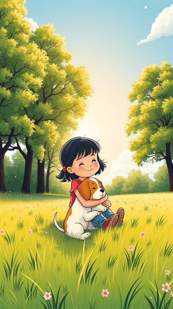 View this AI-generated image featuring in a wide open meadow bordered by tall green trees and a bright expansive sky a playful puppy nestles contentedly in the embrace of a joyful young girl they relish the golden glow of the springtime sun the scene is illustrated in a charming comic style reminisc