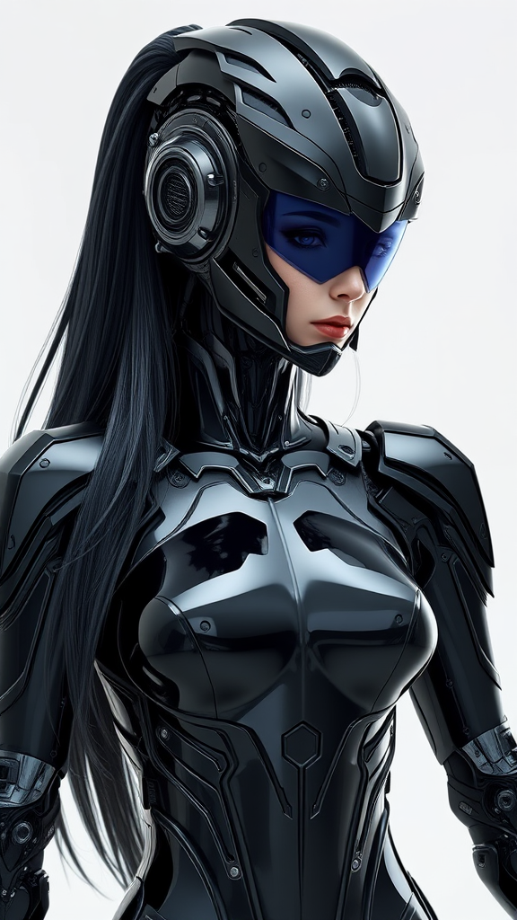 mecha female cyborg with sleek dark glossy armor and a form-fitting bodysuit, long jet-black hair cascading over her shoulders, intricate headgear featuring a mechanical facial visor, detailed body armor components, featuring advanced HDR and subsurface scattering effects, rendered in ultra-high definition, 8K quality, exuding a futuristic and powerful presence.