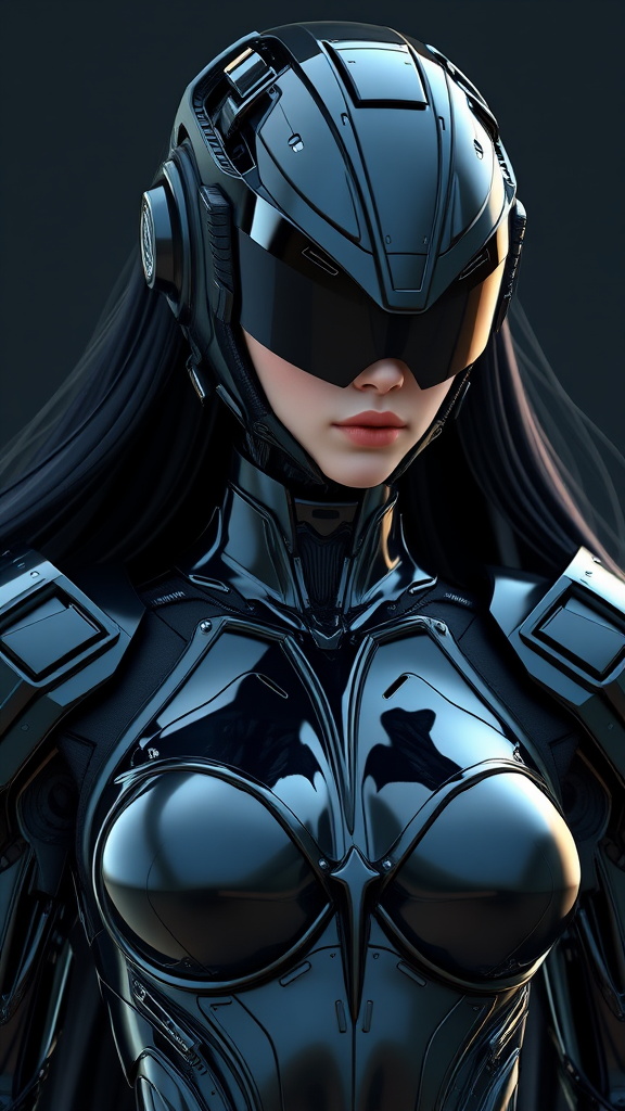 mecha female cyborg with sleek dark glossy armor and an alluring bodysuit, midnight black flowing hair, intricate headgear featuring a mechanical facial visor, detailed body armor components, high dynamic range lighting, subtle subsurface scattering effects, hyper-realistic render, ultra-high resolution 8K quality.