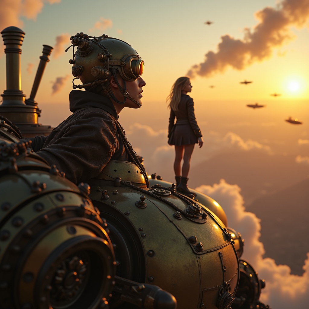 A steampunk mecha pilot with goggles and a leather jacket stands proudly on the massive brass shoulder of her intricately designed mecha; intricate gears and steam vents adorn the colossal machine, puffing clouds into the dawn sky. The horizon glows with a warm, golden light, casting an enchanting glow over the scene. The pilot gazes out at the breathtaking view, a mix of industrial marvels and natural beauty blending seamlessly, as airships soar gently in the distance. Her expression is one of awe and accomplishment, capturing the essence of adventure in this fantastical world.