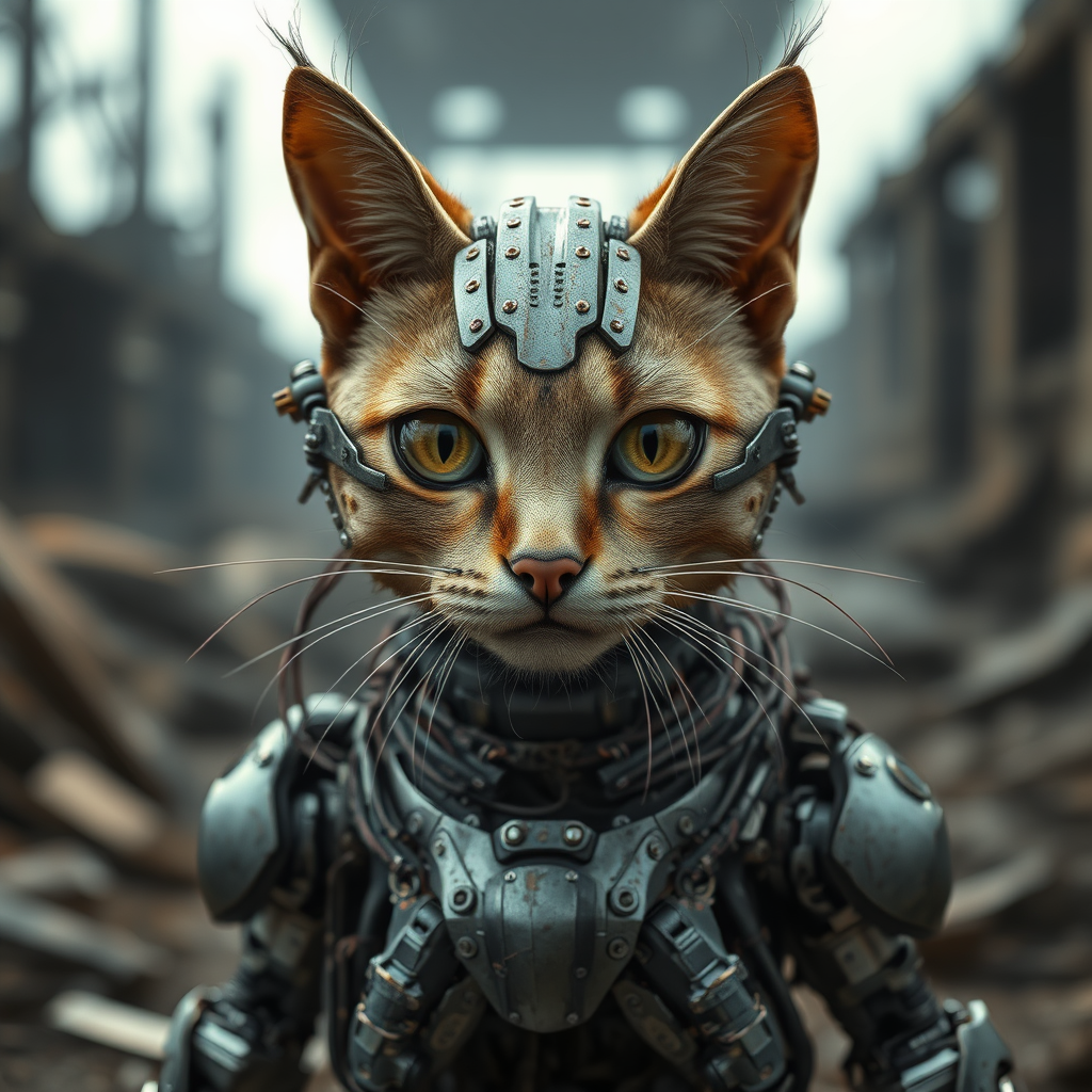 Mechanical cyborg cat, gritty and weathered armor, tarnished metal, robot-like with tangled wires, set against an apocalyptic backdrop. The creature gazes directly at the viewer, captured in a striking portrait style. The photography emphasizes detailed textures, with realistic and photo-realistic elements in 8k resolution. The composition is full-length, showcasing high detail in RAW color art, with a focus on piercing eyes. The lighting is soft and diffused, enhancing the hyperrealism with a shallow depth of field and sharp focus, creating a cinematic atmosphere. The image style is intentionally low resolution, with text errors, overlapping images, and visible jpeg artifacts, contributing to its unsettling and eerie appearance. Emphasizing morbid details, the creature's anatomy is intentionally flawed, with grotesque proportions, missing and extra limbs, and distorted features, such as fused and misshapen fingers. The neck is elongated, with an unsettling arrangement of features that evoke a sense of unease, set against an absence of identifiable marks, such as watermarks or signatures.