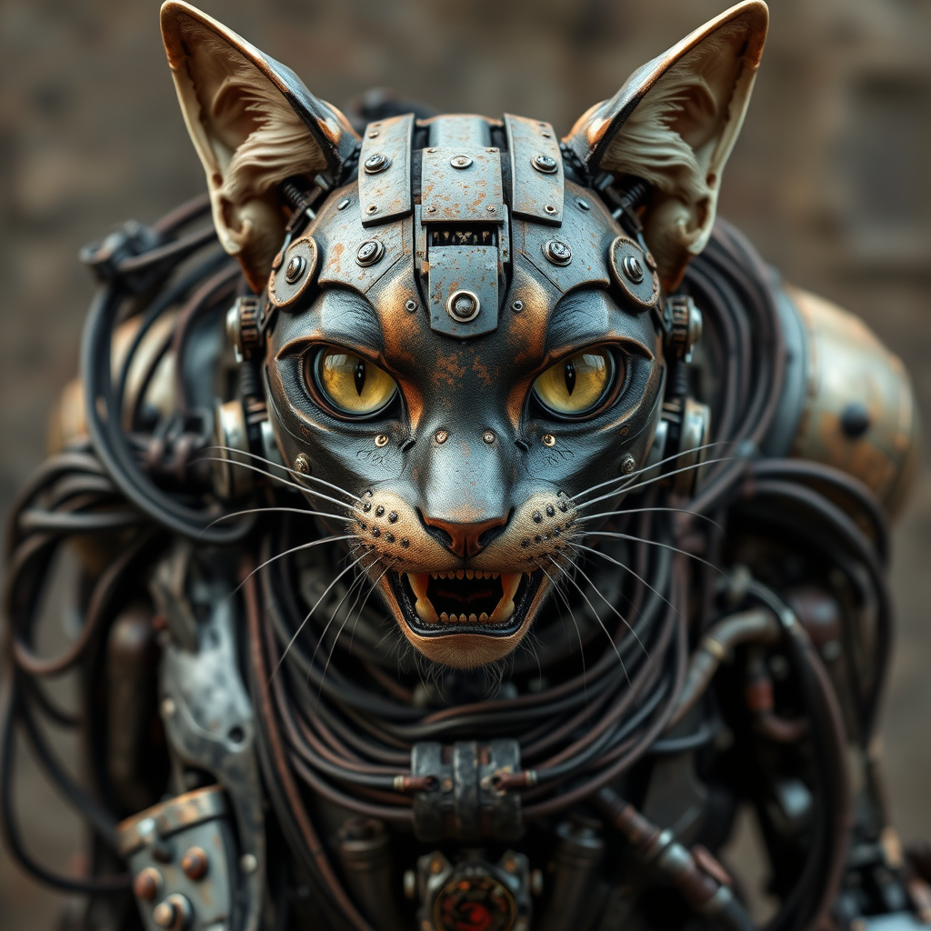 Mechanical cyborg feline, rusty ancient armor, weathered metal, automaton, entangled wires, highly realistic and unsettling, sinister, intricate cables, dystopian backdrop, direct gaze at viewer, portrait-style photography, exquisitely detailed surface, ultra-realistic, photo-realistic 8k quality, meticulously detailed, full-body shot, high-resolution color artwork, intense eyes, soft diffused lighting, shallow depth of field, sharp focus, hyperrealism, cinematic low-light artistry, imperfections like text distortion, cropping errors, low-quality aspects such as jpeg artifacts, unattractive, duplicate imagery, morbid visuals, distorted anatomy, blurry and desiccated details, flawed proportions with extra or missing limbs, fused features, disproportionately long neck.