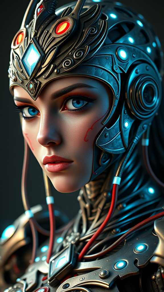 Mechanical Supergirl, detailed portrait, realistic and intricate facial features, global illumination, dynamic shadows, octane render, 8k resolution, ultra-sharp metal textures, ornate and detailed embellishments, cool color palette, Egyptian-inspired design elements, highly intricate and complex details, realistic lighting, trending on CGSociety, luminous eyes, direct gaze, fluorescent accents, mechanical limbs, visible blood vessels with connected tubes, mechanical cervical attachment to neck, wires and cables connecting to head, slight presence of blood, side view, 3D visualization, cartoon influences minimized, focus on high-quality anatomy, avoiding common rendering errors, ensuring clarity and precision in detail.
