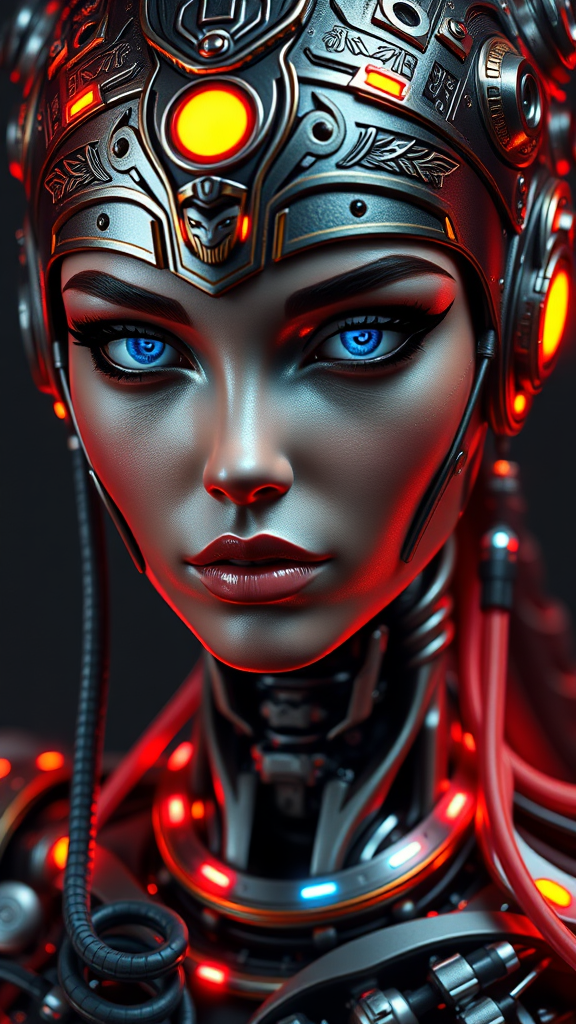 Mechanical Supergirl, portrait featuring a detailed face with global illumination, elaborate shadows, and octane render quality in 8k resolution. The image is ultra-sharp, showcasing intricate metal ornaments with cold color palettes and Egyptian-inspired details. The highly intricate design incorporates realistic lighting, glowing eyes, and a direct gaze towards the camera. The composition includes neon accents, mechanical limbs, and visible blood vessels connected to tubes. A mechanical cervical device attaches to the neck, with wires and cables intertwined with the head. The work is trending on CGSociety, emphasizing technological elements and distinct neon details. The image aims for clarity and precision, avoiding the common pitfalls of low resolution, anatomical inaccuracies, and distracting elements, ensuring a refined and professional visual representation with a touch of creative flair.