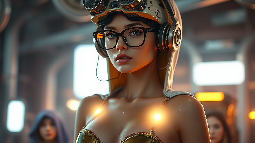 Mechanics, cyborg girl, nuclear art, gloss, depth of field, super detail, cinematic, cyberpunk lighting from multiple sources, cinematic lighting, glasses, mugs, headdress, flat chest, skinny build, glowing elements, piercing, illumination on the chest, hood, bright highlights, headphones, bare neck, slender figure, narrow hips, heels, gold, rivets, folded posture, duality, intricate design, unique expression, captivating details, dynamic composition, enigmatic vibe, artistic flair, seamless integration, harmonious balance.