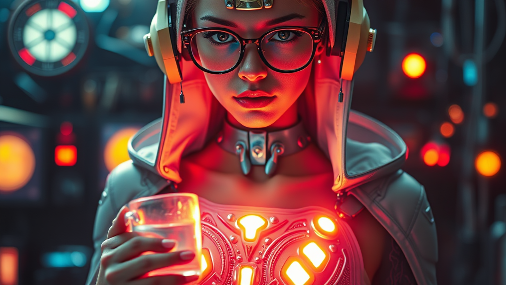 mechanics, cyborg girl, nuclear art, gloss, depth of field, extreme detail, cinematic, cyberpunk lighting from multiple sources, cinematic lighting, Mitakon Speedmaster 65mm, ISO 100, glasses, mugs, headdress, slender build, glowing elements on the chest, piercing, illuminating the chest area, hood, vibrant light, metallic tones, rivets, intricate design, headphones, exposed neck, narrow frame, high heels, radiant light, reflective surfaces, gold accents, mechanical elegance, overlapping forms, dual aspects, abstract interpretation, layered complexity, dreamlike quality, high contrast, nuanced textures, futuristic aesthetic, vibrant hues, ethereal glow, expressive features, dynamic composition, surreal ambiance.