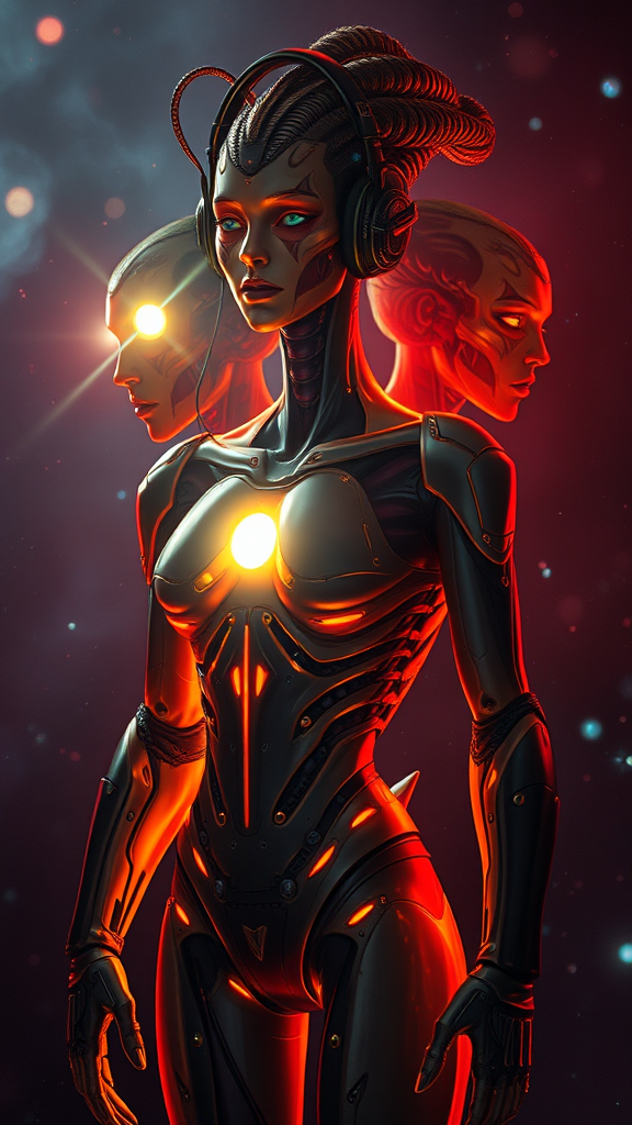 Mechanics, nuclear art, deep space and stars in the background, gloss, depth of field, super detail, cyberpunk lighting from multiple sources, cinematic lighting, deformed mutant hair, glowing chest, piercing light, hood, bright light on the torso, headphones, slender neck, skinny build, narrow hips, high heels, intense brightness, gold elements, rivets, folded torso, dual heads, dual faces, dual torsos, totem-like appearance, distorted face, extra limbs, distorted anatomy, blurred details, unusual anatomy, double-faced, low quality textures, jpeg artifacts, unsettling mutations, hazy imagery, disproportioned limbs, duplicated features, rough proportions, oversaturation, distorted hands, amputation, duplicity in features, misty eyes, dual bodies, lifeless expression.