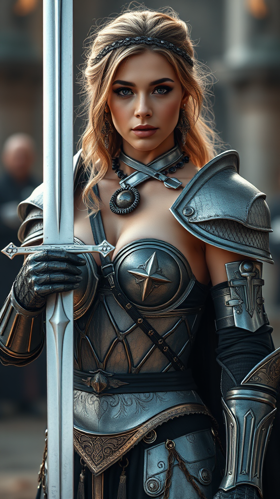 Medieval fantasy female knight, adorned in intricate metal armor that resembles elegant lingerie, exuding a captivating allure, holding a gleaming sword, portrayed in hyperrealistic style, captured with an 85mm lens. A photo with 8k ultra-realistic quality, cinematic lighting enhances high details, creating a focused and dynamic image. Depth of field highlights the subject, shot using a 50mm lens at f/1.4 for added artistic effect. Avoids low quality elements such as text errors, crops, and artifacts. The composition meticulously prevents faults like extra or mutated limbs, ensuring flawless anatomy and proportions. Absence of distortions like a long neck or unnecessary additions, maintaining a pure, visually stunning presentation.