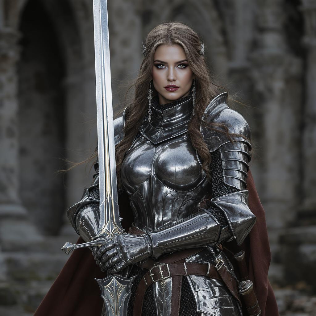 medieval fantasy female warrior, knight in intricately designed metal armor, elegant and alluring, wielding a majestic sword, captured in hyperrealistic detail, focused and cinematic with exquisite light play, showcasing depth of field and sharp focus, ultra-high resolution 8k photograph, using 50mm lens at f/1.4, emphasizing captivating beauty and powerful presence, maintaining refined anatomy and proportions, ensuring an artful and polished composition.