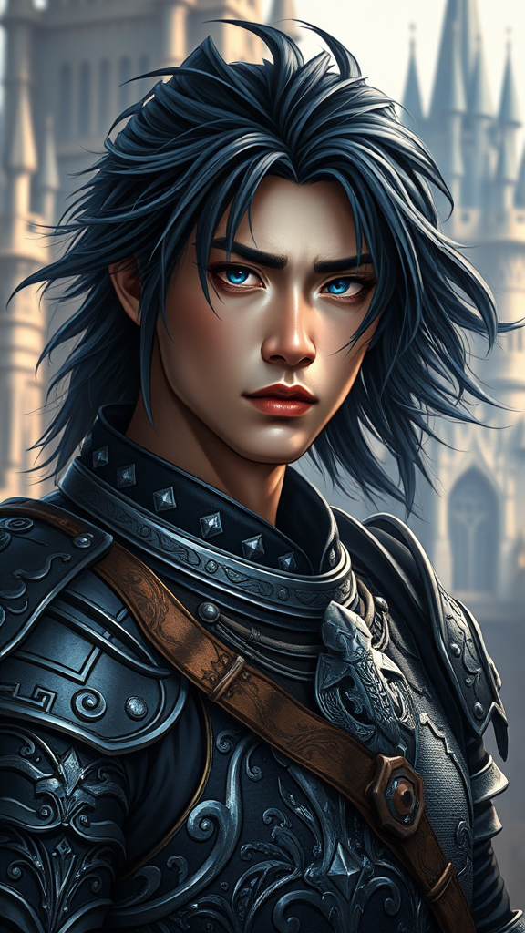 Medieval fantasy portrait of a strikingly handsome male Asian warrior in ornate armor, set against the backdrop of a majestic fantasy castle bathed in the soft glow of morning light filtering from the side, his hair a flowing blend of black and silver strands, eyes shimmering with an electric blue intensity, a hint of unpredictability reflected in his gaze.
