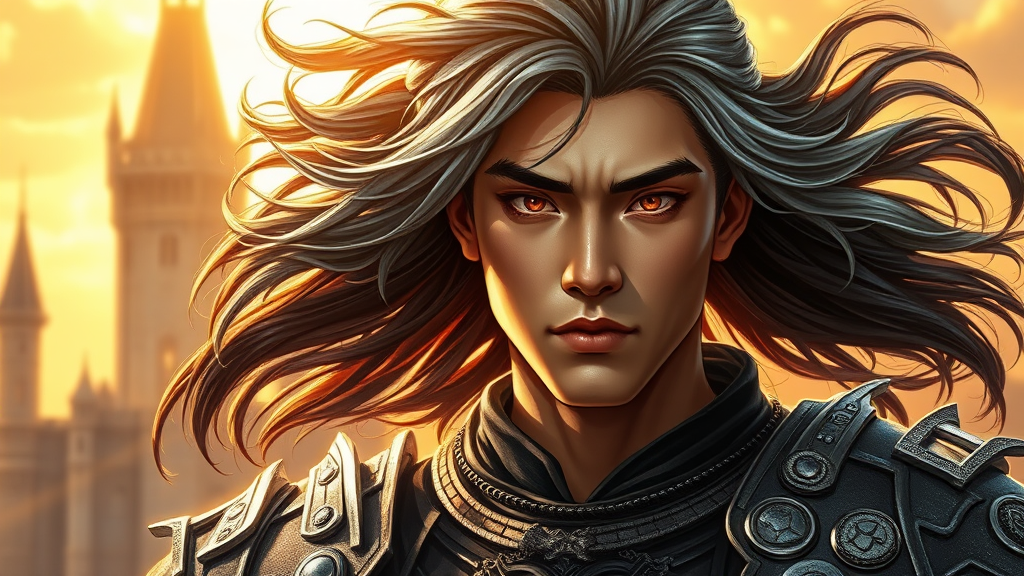 Medieval fantasy portrait of an armored, strikingly handsome Asian warrior standing before an ancient castle, bathed in the bright golden light of dawn. His flowing hair is a striking blend of ebony and silver, glinting in the sunlight like woven metal. His eyes emit an electric glow, both mesmerizing and unsettling, hinting at the controlled chaos within. His expression is intense, exuding a sense of charismatic yet dangerous allure, as if concealing a deep-seated madness beneath his calm facade.