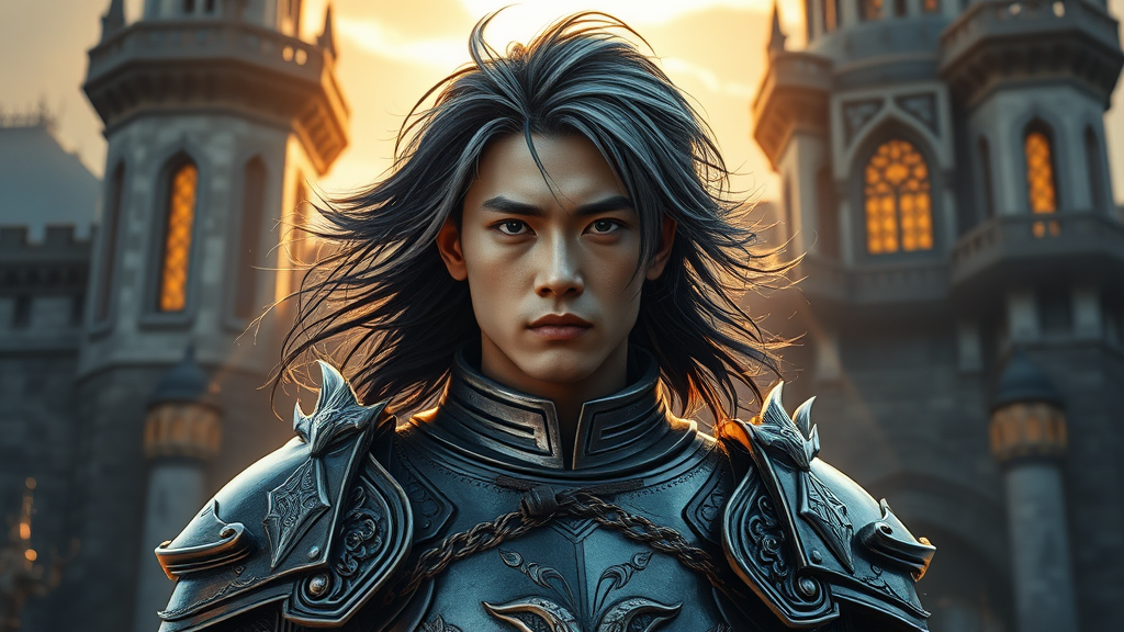 Medieval fantasy portrait of an armored strikingly handsome Asian warrior standing before a grand fantasy castle, illuminated by the radiant morning light. His flowing hair, a striking blend of black and silver, frames his fiercely chiseled features. His eyes, crackling with an electric glow, emit an intense and unnerving energy, hinting at a psychopathic edge beneath his composed exterior. The intricate armor reflects hints of mythical designs, enhancing his imposing presence.