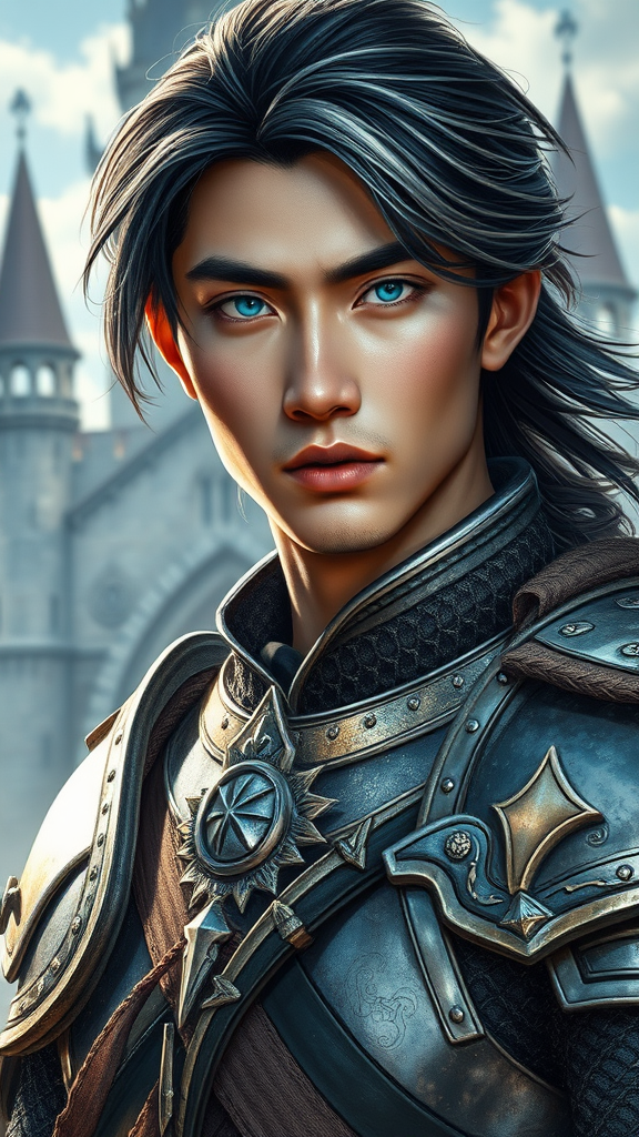 Medieval fantasy scene featuring an armored, strikingly handsome male Asian warrior at the forefront. His battle-worn armor glistens in the bright morning light, casting reflections of the grand fantasy castle behind him. His hair, a striking blend of black and silver, flows around his sharp features. The warrior's electric blue eyes glow with an intense and unsettling ferocity, hinting at a chaotic and unpredictable nature beneath his calm exterior. A subtle aura of mysticism surrounds him, enhancing his enigmatic and formidable presence in the realm.