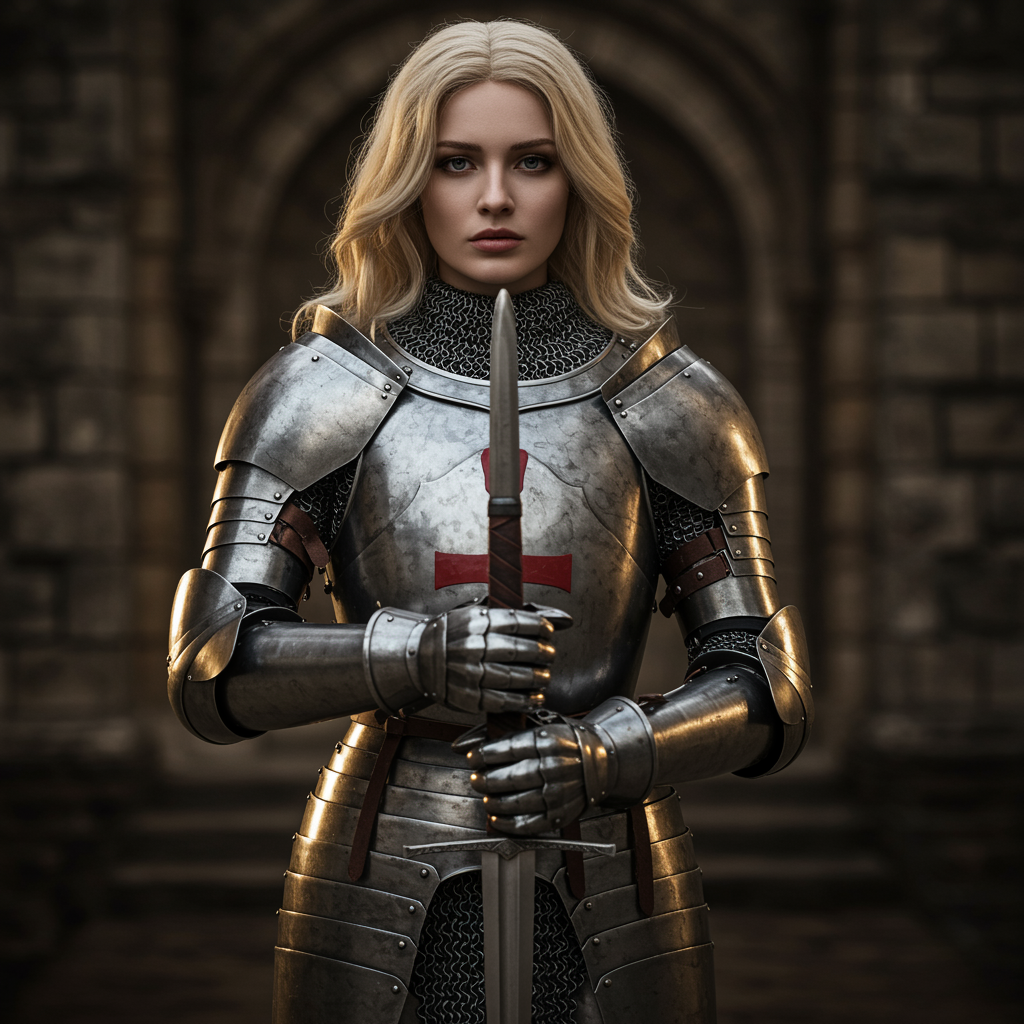 medieval fantasy warrior woman, knight in crafted metal armor, alluring, wielding a sword, hyperrealism, 85mm lens, ultra-realistic photo quality, dramatic lighting, highly detailed, precise focus, enhanced depth of field, 8k resolution, cinematic shot, low aperture for depth, avoiding lowres, maintaining clear image quality, eliminating jpeg artifacts, ensuring aesthetic composition, balanced anatomy, natural proportions, consistent limbs and features, avoiding distortions, clear and vibrant portrayal, capturing essence without digital errors, avoiding watermarks or signatures.