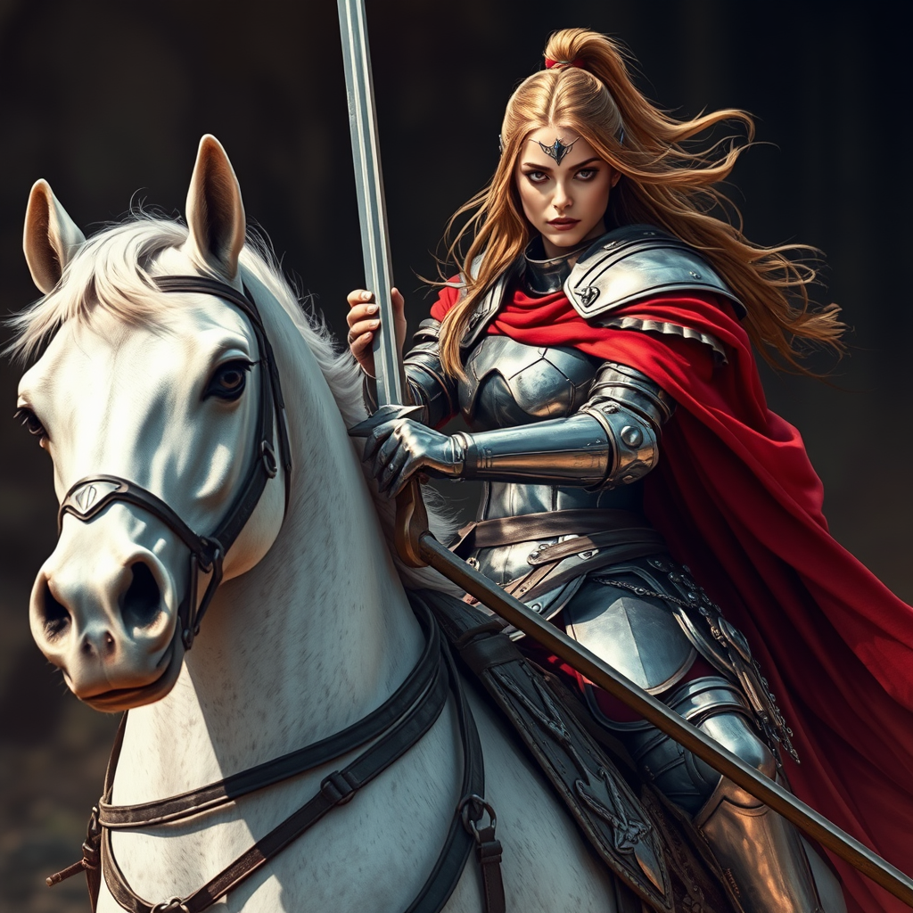 Medieval female knight in a dynamic pose, riding a majestic white steed, exuding heroism and strength, striking detailed features with captivating eyes, an 8k photorealistic masterpiece, influenced by the artistic styles of Jeremy Mann, Sandra Chevrier, and Maciej Kuciara. The scene captures sharp realism with authentic shadows, depicting the knight holding a gleaming sword. The atmosphere conveys a sense of epic grandeur and medieval adventure, maintaining vivid detail and high quality throughout the composition.