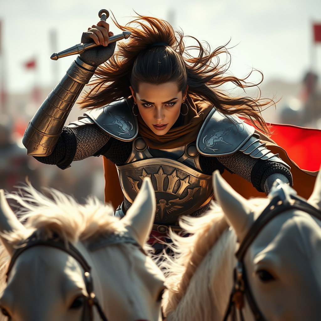 Medieval female knight in action, galloping on a white steed, striking a heroic pose with her sword raised high, her armor gleaming in the sunlight, her expression fierce and determined, intricate details in her face and eyes capturing her strength, Masterpiece, best quality, 8k, photorealistic by Jeremy Mann, Sandra Chevrier, Maciej Kuciara, razor-sharp focus with authentic shadows, realistic surroundings, her hand gripping the reins with confidence, low resolution artifacts subtly softened, creating an immersive and vivid scene that feels alive and dynamic.