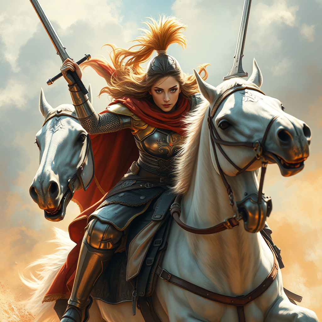 Medieval female knight in action, galloping on a white stallion, striking a heroic pose, detailed features with expressive eyes, masterpiece quality, 8k resolution, photorealistic, inspired by the styles of Jeremy Mann, Sandra Chevrier, and Maciej Kuciara, sharp and lifelike, with realistic lighting and shadows, wielding a gleaming sword, vibrant background, dynamic and powerful presence, exuding courage and strength.