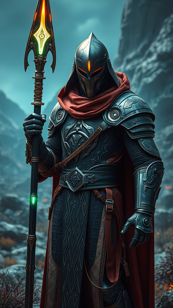 Medieval knight infused with cybernetic enhancements, donned in sleek, futuristic robes adorned with intricate patterns, a glowing staff pulsing with energy in hand, set within a vibrant, sci-fi landscape, photorealistic and cinematic in detail, atmospheric lighting casting dramatic shadows, evoking a sense of ancient mysticism blended with advanced technology.