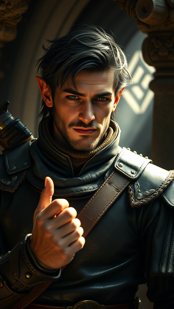 medieval male halfling modelshoot charismatic thief fantasy ambiance intricate details rpg cinematic lighting ultra quality wallpaper 8k friendly expression captivating eyes rugged yet handsome features lean build dexterous fingers adventurous spirit mysterious aura surrounded by shadowy medieval setting wearing finely detailed leather armor confident stance hint of a smirk radiating charm and wit background brimming with rich textures and soft glowing light evoking a sense of adventure and intrigue