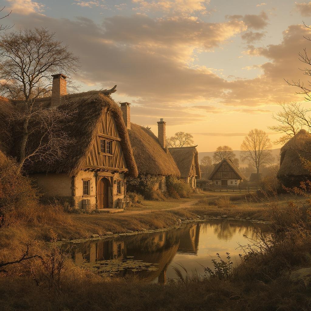Medieval peasant homes, wood-framed, adorned with straw roofs, nestled around a shared pond, evoking a rustic serenity, bathed in the warm glow of sunset, rich in detail and pastoral charm, rendered in photorealistic style reminiscent of Vermeer's works, with the essence of architectural photography.