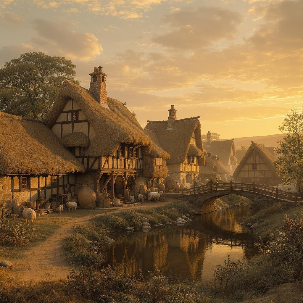Medieval village scene with charming serf cottages, robust timber framing and warm straw-thatched roofs, huddled around a serene communal pond. The setting is bathed in the golden glow of sunset, radiating a rustic ambiance with intricate pastoral details. Captured with a photorealistic touch reminiscent of Vermeer's meticulous style, evoking a sense of timeless tranquility and architectural elegance.