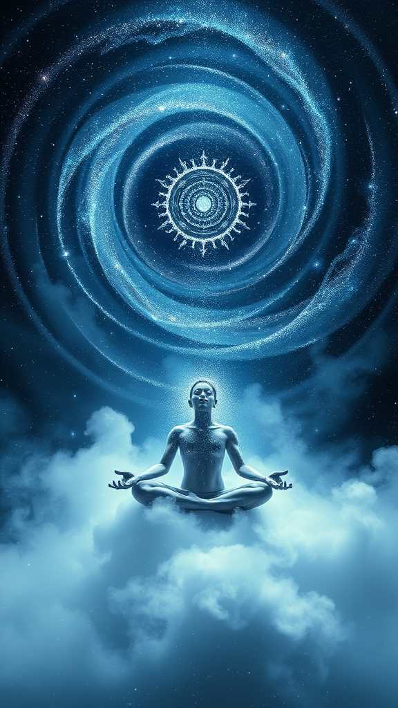 Meditation unveils its own enigma as swirling galaxies of dark indigo merge with shimmering silver, creating surrealistic dreamscapes where time distorts; ethereal figures float through celestial mists, their unconventional poses bending reality as stardust cascades around them, bathing the scene in a celestialpunk glow, while ancient whispers echo in the void, enticing one deeper into the meditative trance.