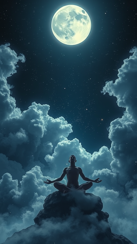 Meditation unveils the enigmas of meditation itself, weaving surreal and dreamlike imagery where dark indigo skies blend with silver mists. Celestialpunk elements scatter through the expanse, crafting surrealistic dreamlike scenes under an ethereal moonlit glow. Figures strike unconventional poses, suspended between reality and fantasy, as cosmic clouds swirl around them. Stars glimmer like scattered jewels, casting their light on this otherworldly landscape, where each breath deepens the mystery of the universe’s whisper.