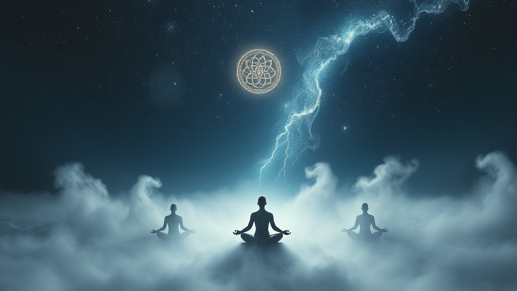 Meditation's enigma unfolds in ethereal realms, where dark indigo skies meet shimmering silver cascades, forming surreal dreamscapes infused with celestialpunk allure. Mist swirls around figures in unconventional poses, their forms almost fluid, merging with the stars above. Floating islands drift through a cosmic sea of dreams, where time bends and reality blurs. Ancient symbols glow softly on velvety horizons, guiding the way through this otherworldly meditation sanctuary.