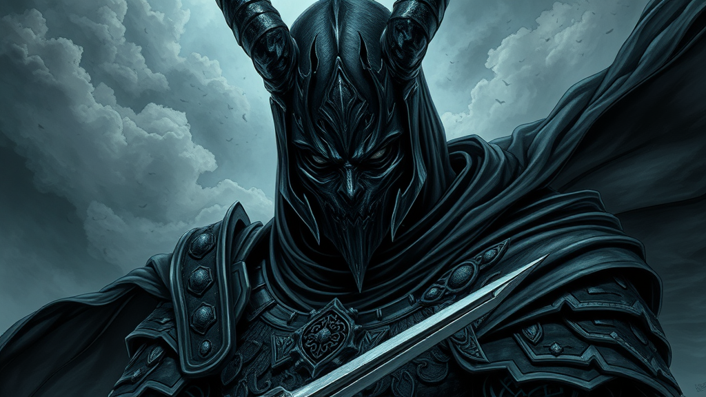 Medium close-up, captivating illustration of an enigmatic demonic knight in obsidian medieval armor, face shrouded, majestic cloak, dynamic composition, dignified, turbulent skies, mist-laden, shadowy fantasy, somber, intense emotional resonance, ultra high-resolution, highly intricate, extraordinarily detailed, inspired by the styles of Milo Manara and Russ Mills, intricate illustration, 8k, superbly detailed, focus on visual richness, atmospheric depth, evocative fantasy, dark and moody ambiance.