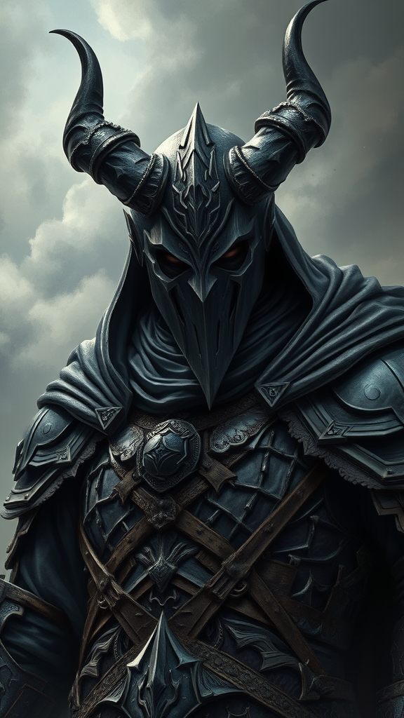 Medium close-up illustration of a demonic warrior clad in intricate black medieval armor, with a masked face and billowing cloak. The composition is epic, set against a backdrop of stormy skies and fog, conveying a dark fantasy theme with a gloomy and dramatic atmosphere. The character exudes pride and emotional depth, captured in a detailed and meticulously crafted illustration reminiscent of works by Milo Manara and Russ Mills. The scene is rendered in ultra-high detail, features textures and layers that enhance the mood and complexity, with 8k resolution showcasing every nuance. Despite the detailed focus, there are no artifacts like text, signatures, watermarks, logos, or other intrusions on the visual storytelling. The anatomy and proportions are carefully considered to avoid any distortions or awkward features, ensuring the warrior maintains a commanding and cohesive presence in the scene.
