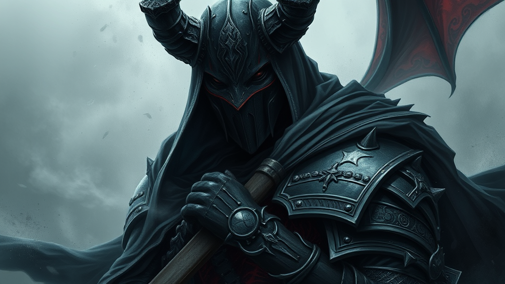 Medium close up of a breathtaking illustration of a demonic warrior clad in dark medieval armor, face obscured by a mask, with a flowing cloak. The composition is epic, conveying pride amidst stormy weather and fog. Set in a dark fantasy realm, the scene is gloomy and dramatic, capturing emotional depth. The artwork is of exceptional detail and intricacy, inspired by the styles of Milo Manara and Russ Mills, achieving an 8k level of detail. The illustration is artfully bound with rich emotional storytelling, showcasing the character's aura amidst the ominous environment without any need for textual additions or distortions typically found in poorly rendered images.