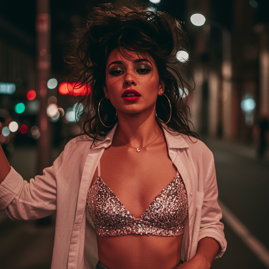 A vibrant medium close-up photograph of an energetic young woman with tousled black hair, adorned in a designer sequin bralette beneath a loosely opened blouse, complemented by large hoop earrings and a delicate necklace. Her outfit appears slightly askew, hinting at a lively evening spent exploring the city nightlife. Her lips are highlighted with a bold lipstick, while her eyes are accentuated by shimmering dark eye shadow. The outdoor city setting envelops her in a late-night ambiance, with enhanced contrast emphasizing the intricate details of her glowing skin, capturing the essence of an unforgettable night.