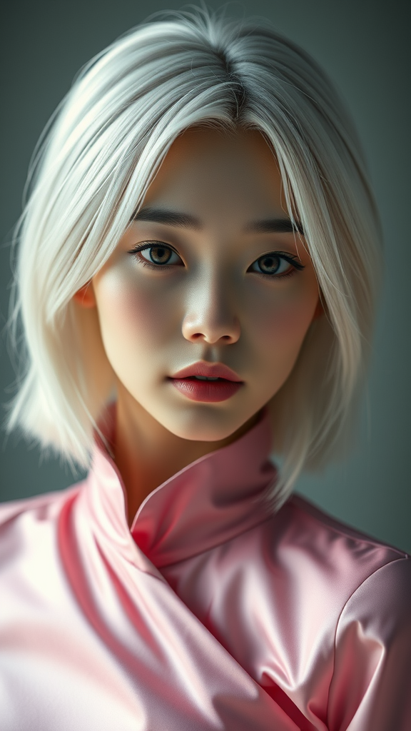Medium-length platinum hair, a young South Korean girl wearing elegant pink attire, an athletic body, a beautifully detailed face, captivating eyes, fit physique, soft cinematic lighting, shallow depth of field, professional high-quality photo, ultra-high resolution, intricately detailed CG 8K art, using physics-based rendering for photorealistic results, masterpiece level of realism with dramatic lighting, emphasizing skin texture, captured with a Nikon D850 on Kodak Portra 400 film stock, rich colors with hyper-realistic lifelike textures, trending on Artstation as cinematic digital art.
