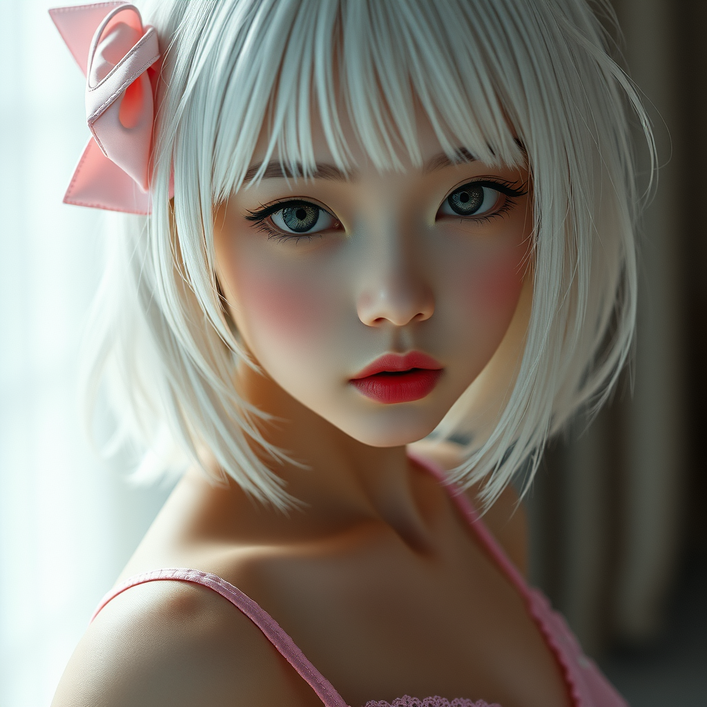 medium length white hair, a young South Korean girl in elegant pink lingerie, balanced physique, exquisitely detailed face reminiscent of Greg Rutkowski and Magali Villeneuve's artistry, captivating eyes, athletic build, cinematic lighting, focused depth of field, photography 3d aesthetic, doll-like features, rendered in octane, with elements of surreal distortion, creating an intriguing blend of reality and abstraction, emphasizing imperfect beauty through unusual anatomy and characteristics.