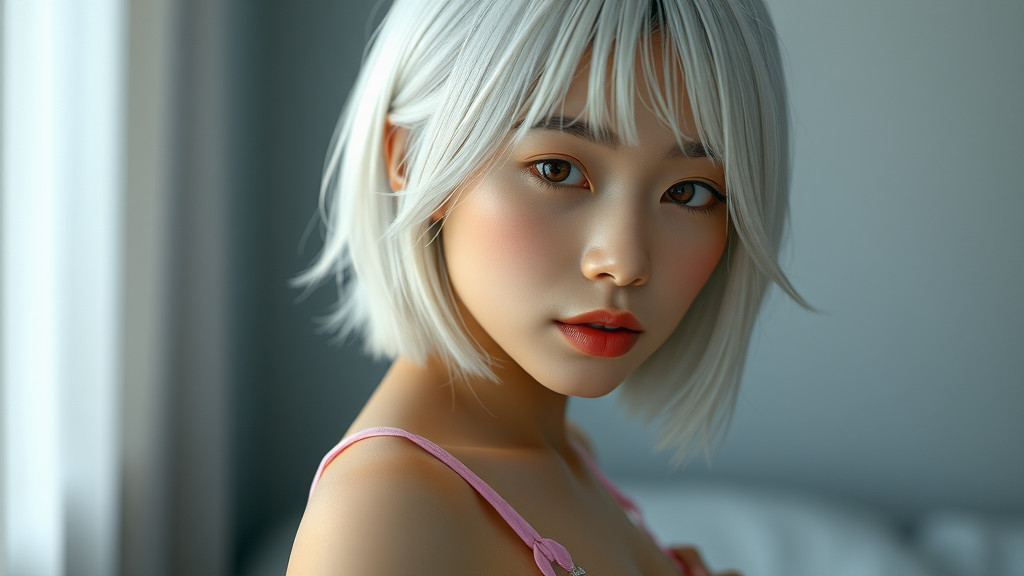 Medium-length white hair, a young South Korean girl with a proportional body wearing pink lingerie, photorealistic with a highly detailed face and beautiful eyes. Toned body under cinematic lighting and depth of field, captured in high detail RAW color as a professional photo. Ultra high-resolution, highly detailed CG wallpaper with physics-based rendering. Features cinematic lighting, realism, high contrast, and trending photorealistic digital art on Artstation. Detailed realistic skin texture with lifelike texture, using a Nikon D850 film stock photograph with rich colors, dramatic lighting akin to Unreal Engine compositions. Avoids common pitfalls like poor anatomy and includes best quality attributes in ultra high resolution. The focus is on sharp, clean high-resolution details with no blemishes, maintaining a high standard for realistic imagery.