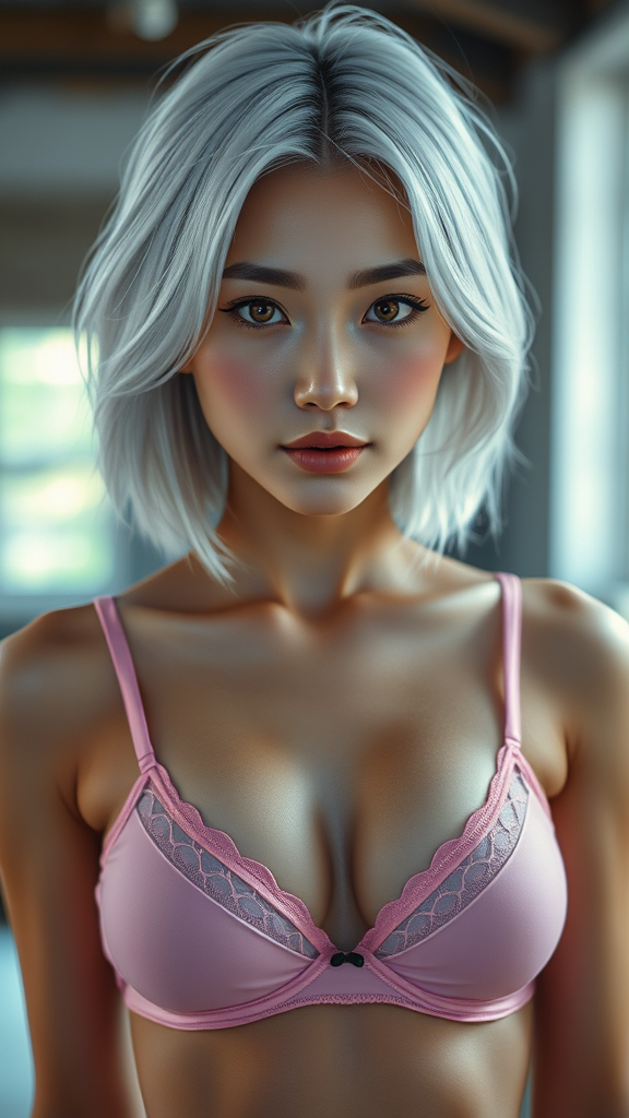 medium-length white hair, young South Korean woman wearing pink lingerie, balanced physique, highly detailed facial features, captivating eyes, toned body, cinematic lighting, depth of field, high detail RAW photo, ultra high resolution, detailed CG 8K wallpaper, physics-based rendering, photorealistic, realism, photorealism, high contrast, hyper-realistic digital art trending on Artstation 8k HD, realistic skin texture, best quality imagery, ultra high resolution, sharp, captured with Nikon D850 using Kodak Portra 400 film stock, rich colors, lifelike texture, dramatic lighting, trending on Artstation, avoiding typical flaws like poor anatomy or deformations, maintaining harmony in proportions, clear and focused composition without any visual distortions or imperfections.