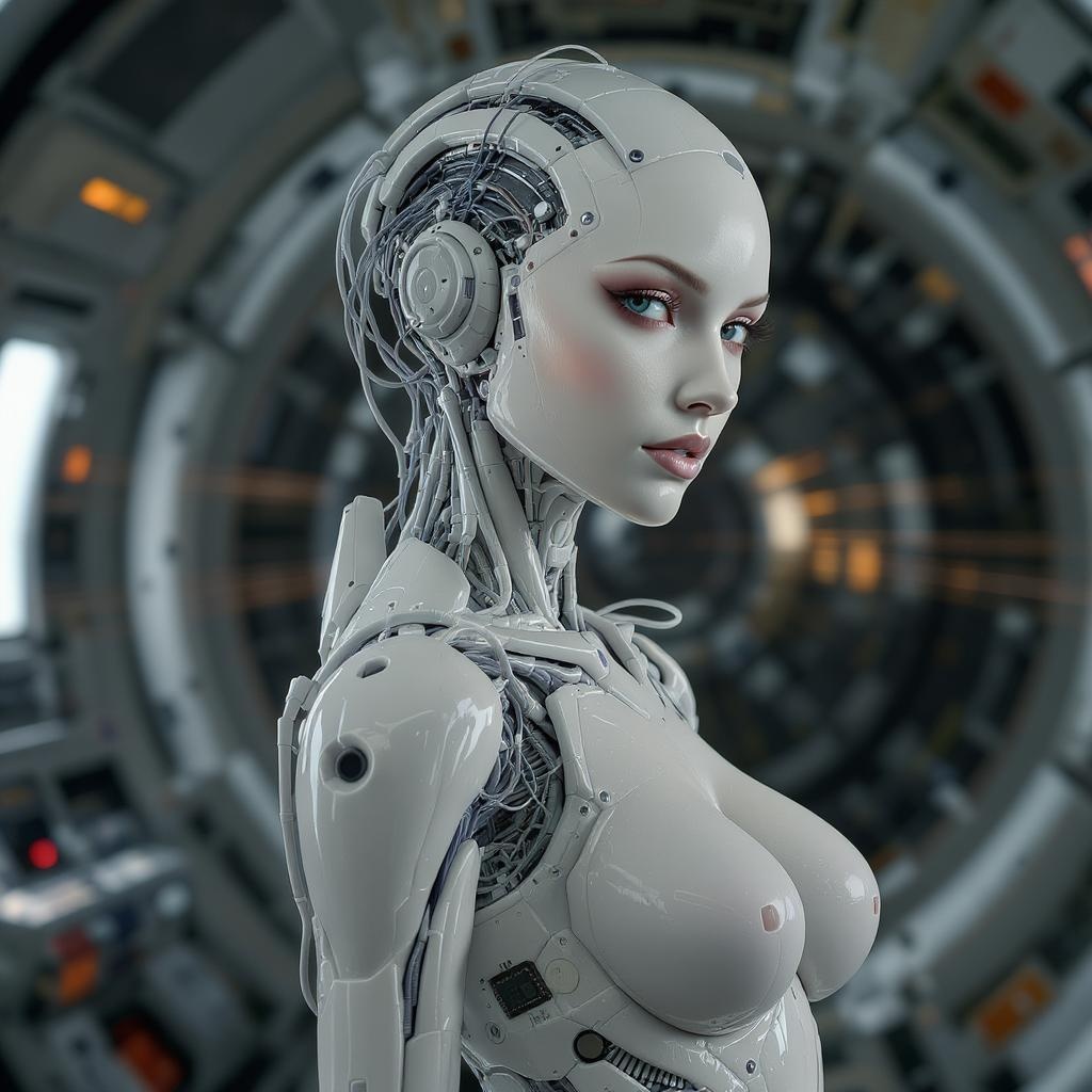 medium long shot photo, stunning woman with a porcelain robot body, captivating android face, head adorned with wires and porcelain, highly detailed eyes, pristine skin, intricate robotic elements, cyborg, portrayed in a sideways pose showcasing numerous robotic components, embedded wires, and microchips, elegant and extremely complex design, full body depicted with anatomical precision, set against a detailed spaceship background, rendered in octane with unreal engine, top-tier quality, a masterpiece of photorealism, hyperrealistic, modeled in a shoot style reminiscent of A Space Odyssey movie, art influenced by Stanley Kubrick and Geoffrey Unsworth, enhanced with god rays, lens flare, specular lighting, depth of field effects, captured in RAW on a Sony Alpha 1 with an 85mm lens at f/1.4 GM, utilizing long exposure for hard focus, smooth cinematic film still quality, center framed and symmetrical, UHD, HDR, 8k resolution, imaginative yet realistic, avoiding cartoonish distortions or errors in anatomy or proportions.