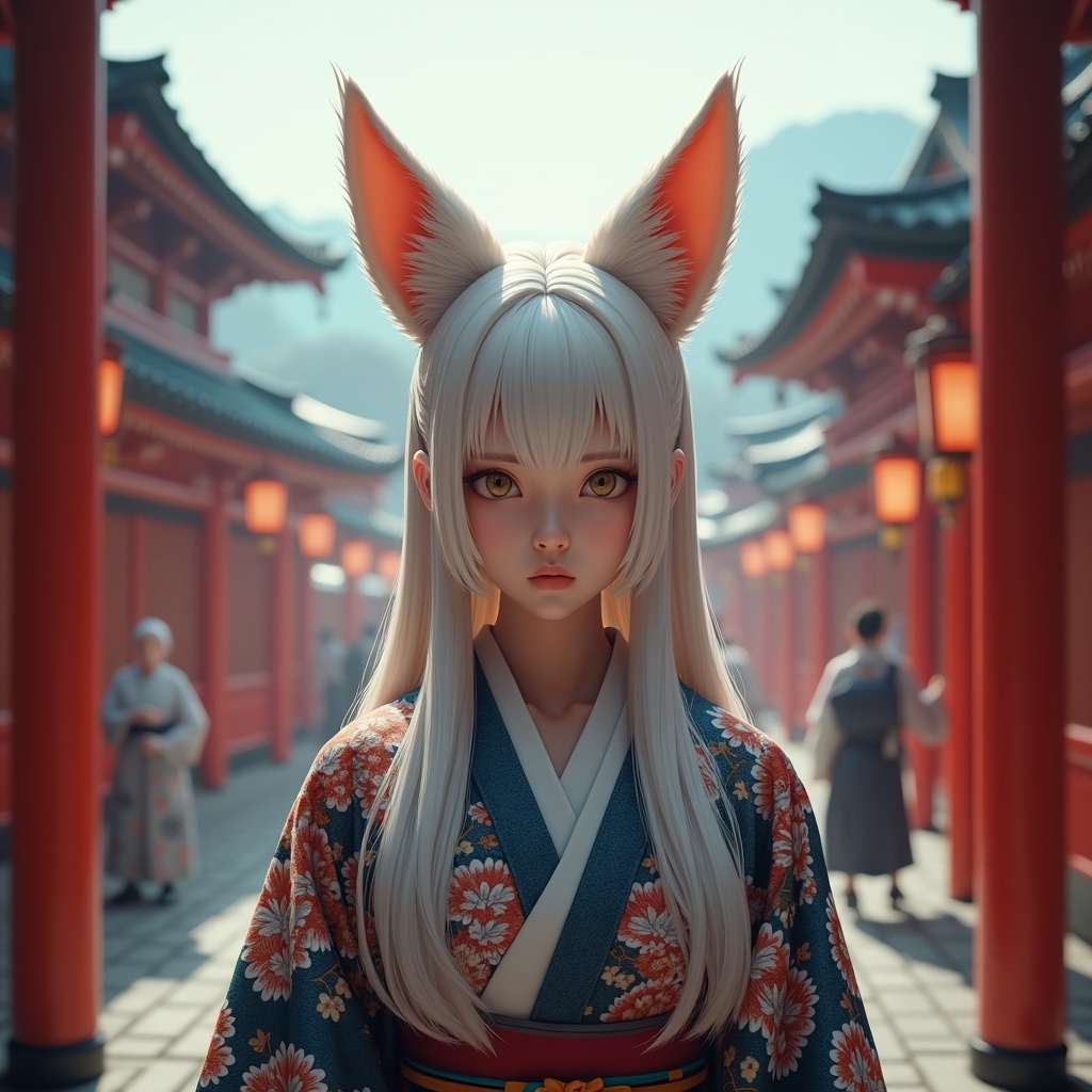 Medium shot, centered, full-body view of a single female figure in sharp focus, wearing an intricately detailed kimono. She has fox ears and a flawlessly symmetrical face framed by long white hair parted in the middle. Her expression is one of subtle anxiety. The scene takes place against the backdrop of a highly detailed medieval Japanese city, bursting with vivid colors and intricate designs. The atmosphere is elegant and graceful, featuring cinematic lighting that enhances the scene's glamour. Rendered in HDR and UHD, the image achieves a professional quality akin to an octane-rendered photograph, showcasing special effects that add depth. This artwork is of a caliber trending on platforms like ArtStation, emphasizing the hyper-detailed and artistic portrayal of both the subject and the environment.