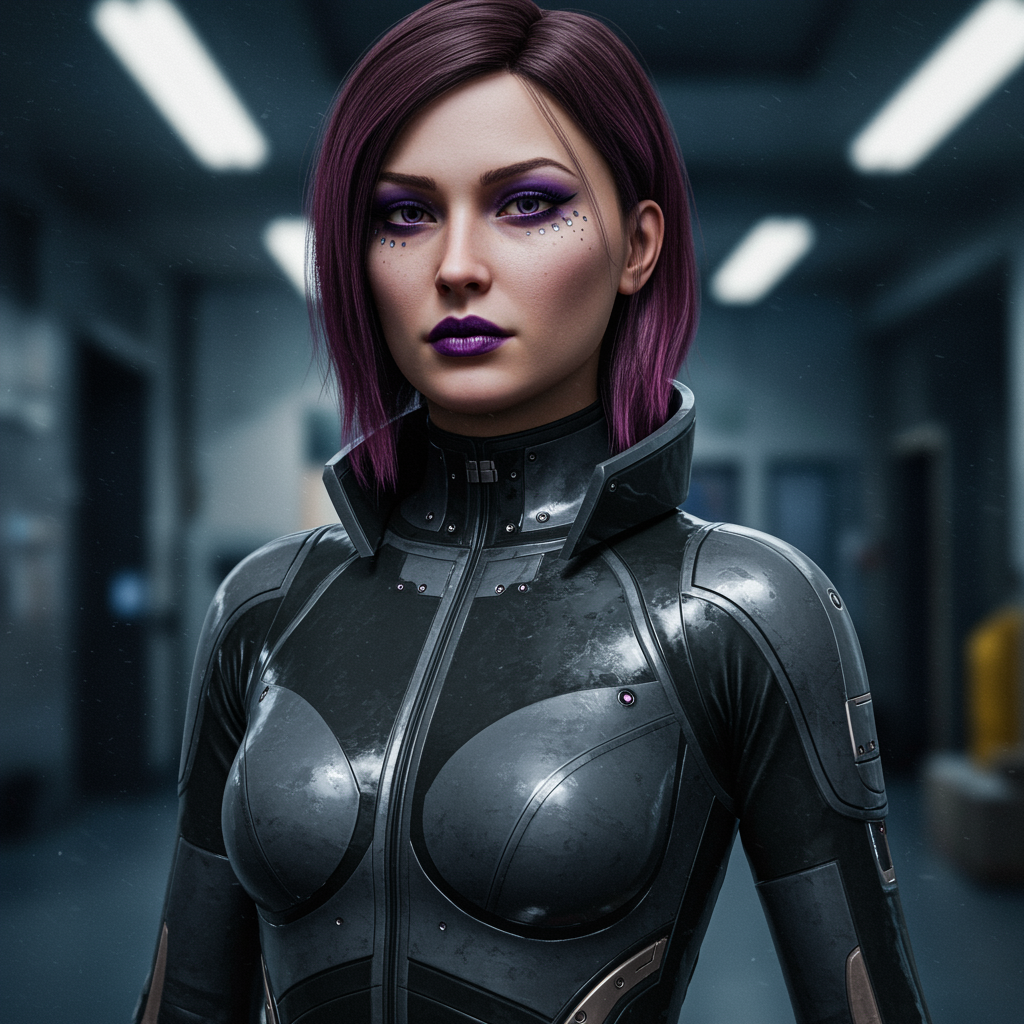 medium shot portrait of a female soldier from the future, wearing a sleek futuristic latex suit with metallic accents, artistically applied makeup highlighting her features, deep purple lips, standing tall, theme of futurism in a cinematic style, captured with film-like lighting, photorealistic quality, rendered using octane and unreal engine, highly detailed with volumetric lighting, maintaining hdr quality, avoiding low resolution issues and unwanted artifacts, ensuring correct anatomy and proportions, ensuring clarity and focus, avoiding unwanted visual errors, keeping composition within frame and eliminating distortions like extra limbs or fused fingers, avoiding watermarks and signatures.