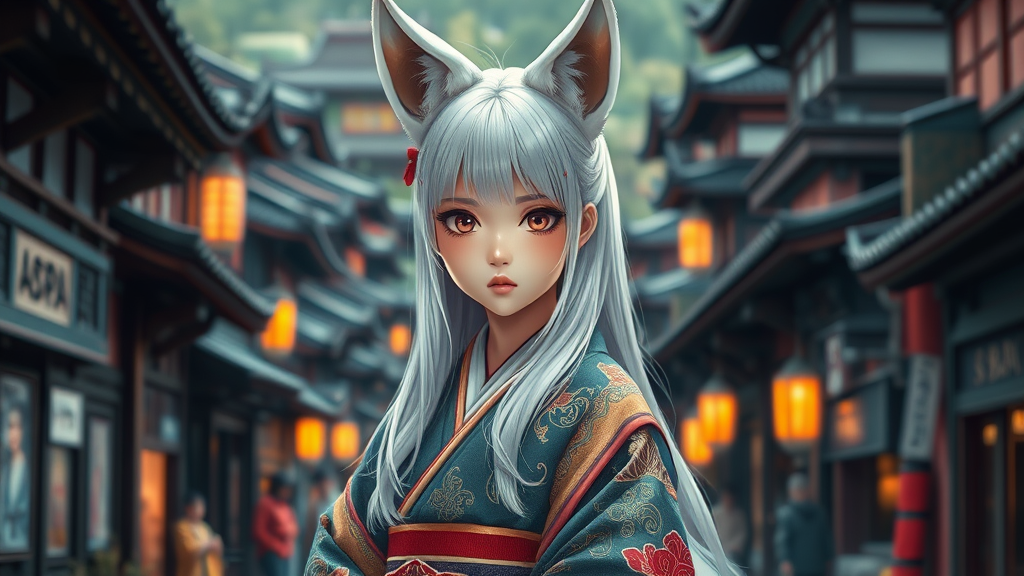 Medium shot, focused, full body of a girl in a hyperdetailed kimono with fox ears, perfect facial features, long white hair with a middle part, exhibiting an anxious expression. Set against a lively and intricately detailed medieval Japanese city background, bursting with vivid colors. The scene is elegant and graceful, captured in cinematic lighting, showcasing HDR and UHD qualities. Rendered in high resolution 64k with special effects, akin to an hd octane render, resembling a professional studio photograph. This image is trending on art platforms for its breathtaking and immersive detail.