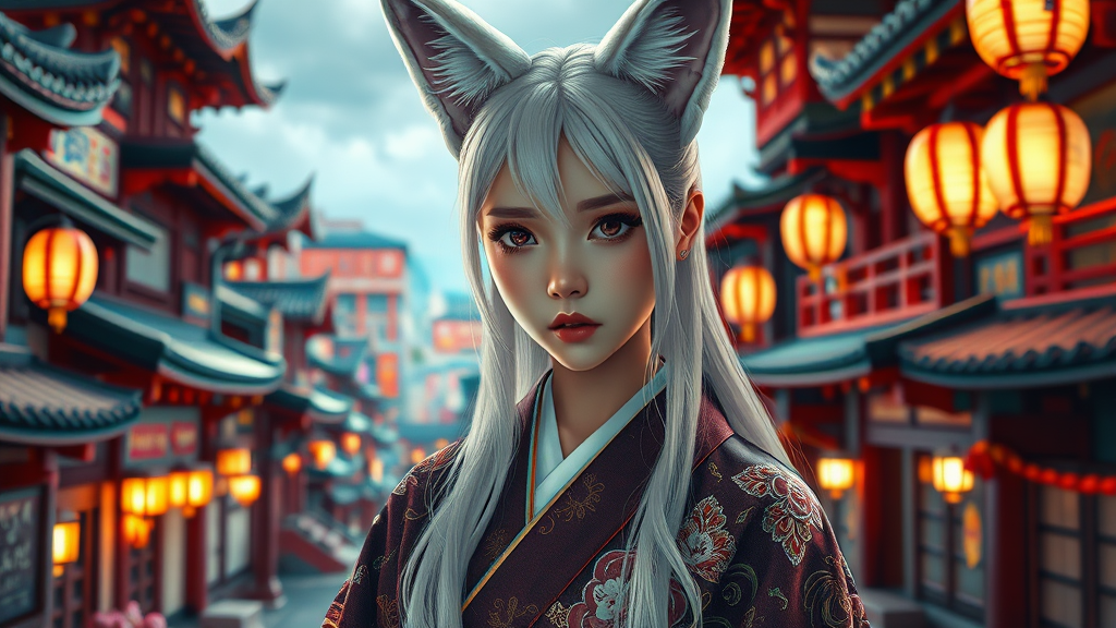 Medium shot of a full-body view of a young woman with fox ears, wearing a hyperdetailed kimono. She has a perfect face with long white hair parted down the middle, and an anxious expression. A colorful, glamorous, and intricately detailed medieval Japanese city serves as the vivid backdrop. The image is characterized by elegance and grace, shot in cinematic lighting with special effects. The photograph boasts HDR, UHD, 64k resolution with high-definition octane rendering, a professional studio-like quality, and the look of a trending art piece on ArtStation.