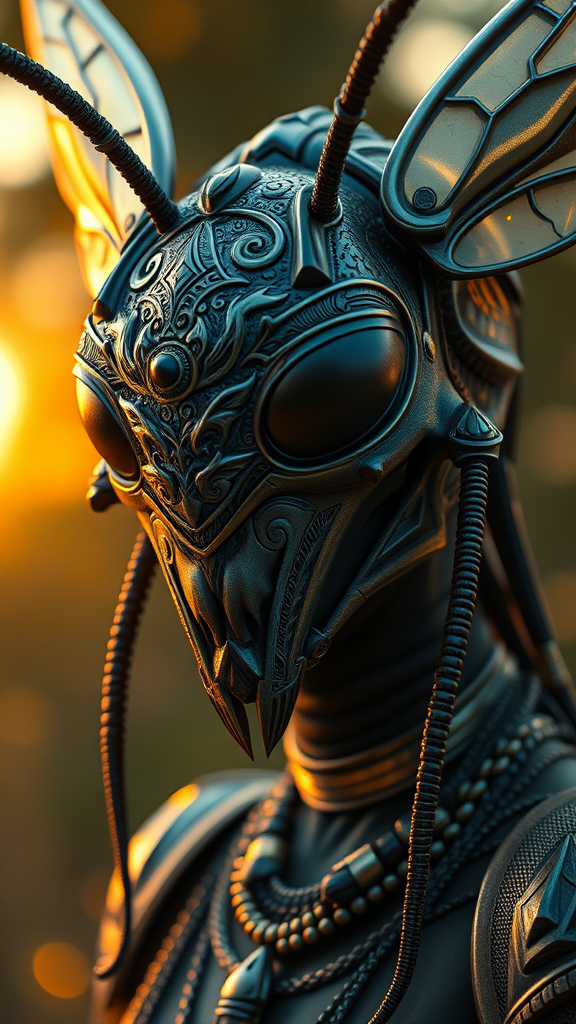 medium shot portrait featuring ethereal totemic implants, exquisitely detailed wasp mask with intricate ornamentation. The character is designed with influences from artstation, captured in the golden hour, surrounded by a lush bokeh effect. A creature-like aura permeates, digital artistry inspired by Tooth Wu, WLOP, Android Jones, Beetle, and Greg Rutkowski. Set in a surreal dimension, with subtle hues and dynamic contrasts --s 1100 --c 120 --q 2.5 --ar 3:4