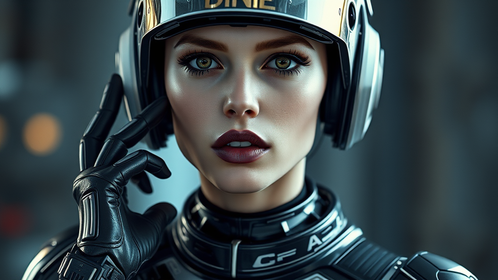 medium shot portrait, female soldier from a futuristic world, wearing a sleek space-age latex suit with metallic accents, intricate makeup highlighting her face, deep purple lips contrasting her attire, full-length portrayal, embodying the essence of futurism, cinematic influence, film lighting, photorealistic quality, octane render style, 3d visualization, unreal engine precision, hyper detailed elements, volumetric lighting effects, hdr capture, maintaining low resolution aesthetic, text presence, glitches, cropped appearance, intentionally degraded quality, jpeg artifacts, unconventional beauty, surreal, distorted, experimental anatomy, emphasizing artistic flaws, intentional disfigurement, exaggerated features, abstract proportions, surreal limbs, cloned facial elements, captivatingly unsettling, malformed extensions, artistic mutation, uniquely proportioned, creatively bizarre, whimsically malformed, avant-garde design, abstract digital artifact presence.