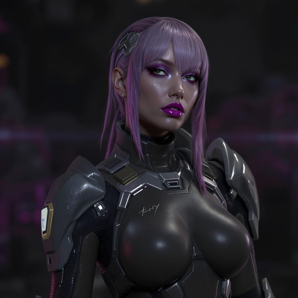 medium shot portrait, female soldier from the future, adorned in a sleek futuristic latex suit with metallic elements, artistic makeup highlighting the face, rich purple lips, in full stature, embodying futurism, cinematic ambiance, filmic lighting, movie frame, photorealistic, octane render, 3d depiction, unreal engine, highly detailed, volumetric illumination, hdr quality, textural imperfections, low resolution, compression artifacts, unappealing, duplicate imagery, distorted, fragmented, off-frame, excessive fingers, mutated hands, irregularly drawn hands, irregular face features, anomalies, deformed, out of focus, dry appearance, flawed anatomy, disproportionate, extra limbs, replicated face, disfigured, disproportionate features, malformed limbs, absent arms, absent legs, surplus arms, surplus legs, interconnected fingers, excessive fingers, elongated neck, identification marks, logos, autographs.