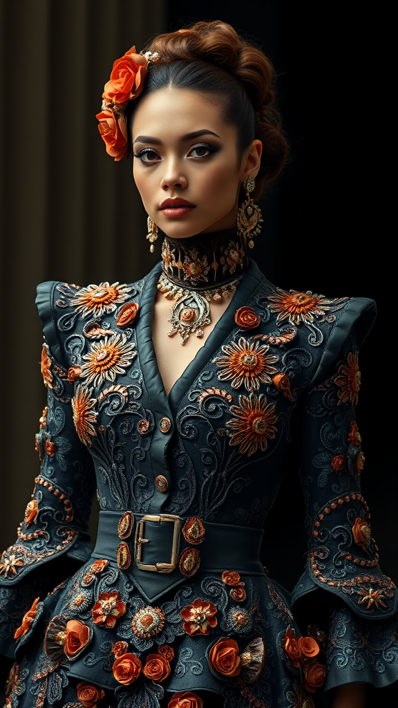 Medium shot portrait of a striking model in a couture Balenciaga ensemble, fashion editorial style, intricately detailed, artful composition, vibrant contrasts.