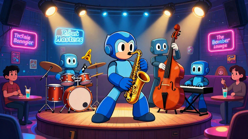 A vibrant cartoon illustration features Mega Man as the lead saxophonist of a robot jazz band on a wooden stage. The lively lounge setting is illuminated by neon signs and disco lights, with human and robot patrons enjoying the music.