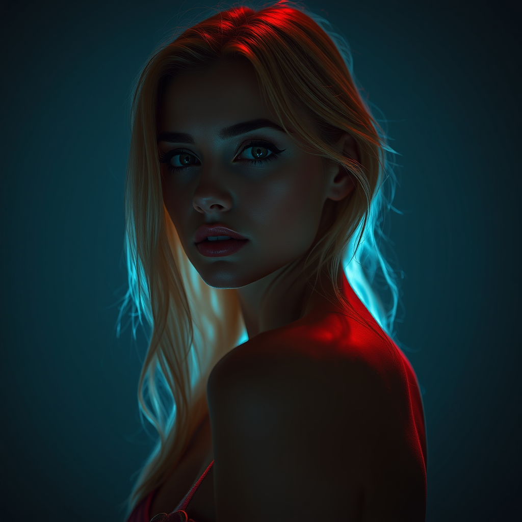 Melainotype capture of a striking blonde woman, cinematic lighting enveloping her form in the style of a masterfully captured Unreal Engine 5 scene. This editorial photograph, echoing the elegance of a professional photoshoot, is shot using a majestic 70mm lens, exhibiting profound depth of field with a gracious tilt blur. With a shutter speed set at 1/1000 and an aperture of f/22, the photo boasts remarkable clarity and definition at a white balance of 32k. The image's super-resolution and megapixel brilliance are highlighted in the ProPhoto RGB color space, with a subtle nod to VR innovation. In the spirit of artistry akin to Artgerm and Alex Ross, the composition features halfrear lighting complemented by a captivating backlight. Immerse yourself in the natural allure of incandescent, optical fiber infused lighting, elevating the moody and cinematic ambiance. Studio lighting interplays with soft and volumetric elements, crafting an enchanting contre-jour effect. The use of dark lighting is accentuated by a gentle red rim light, while cool color grading at 45% weaves a serene tonal balance. The image showcases optics mastery, with scattering and shimmering shadows accentuating its rough yet alluring aesthetic. Advanced ray tracing techniques enhance the narrative, incorporating screen space and global illumination for layered depth. Refined reflections, diffraction grading, and chromatic aberration embed a hyper-realistic texture. GB displacement and scan lines subtly nod to a futuristic aesthetic, with seamless ray-traced ambient occlusion refining every detail. High-level anti-aliasing, including FKAA and TXAA, alongside RTX, SSAO, and cutting-edge shaders, enrich the image with sophistication. Post-processing and post-production infuse cel shading and tone mapping, bridging CGI with VFX and SFX mastery. The piece stands as an ultra-detailed, hypermaximalist marvel, elegantly presented with dynamic pose and meticulous centering, pushing the boundaries of hyper-realistic photography into new artistic realms.